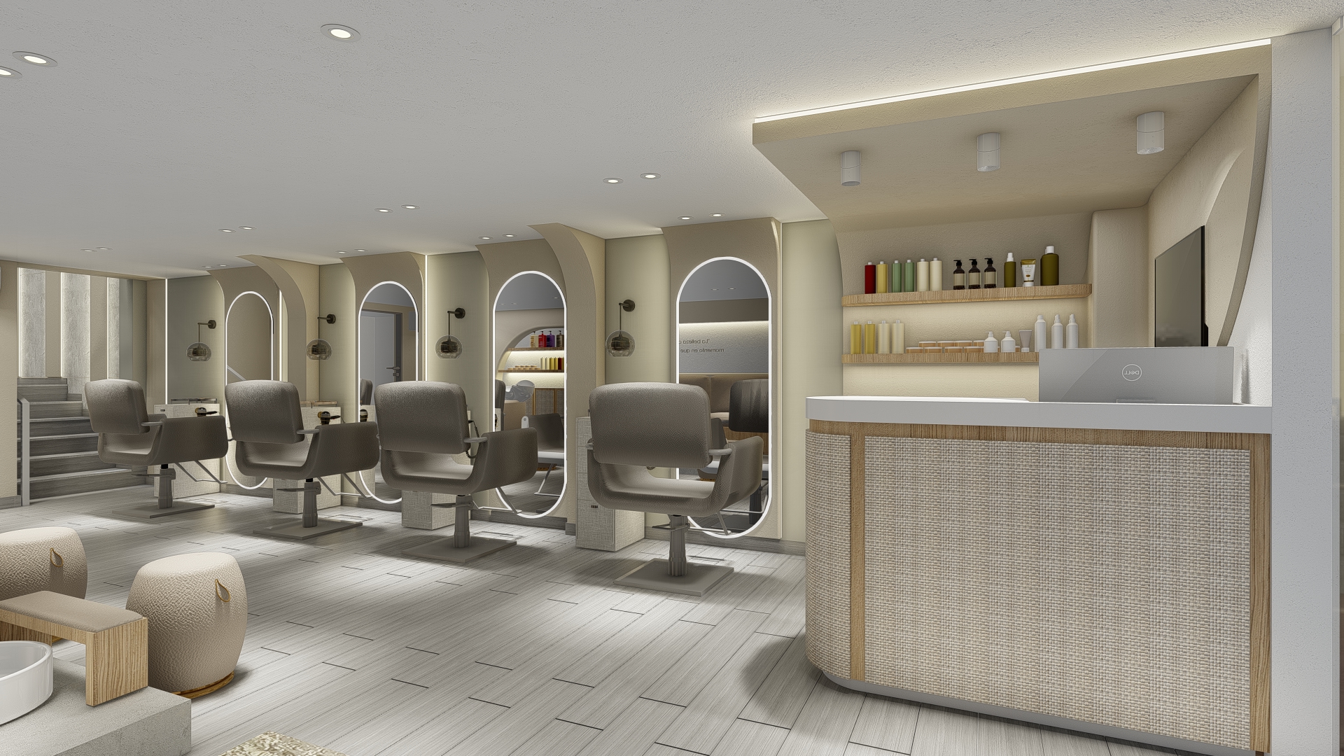 Diseño compacto y pulcro que mantiene el ritmo profesional del sálon con un area de transición de espera y spot fotografico.