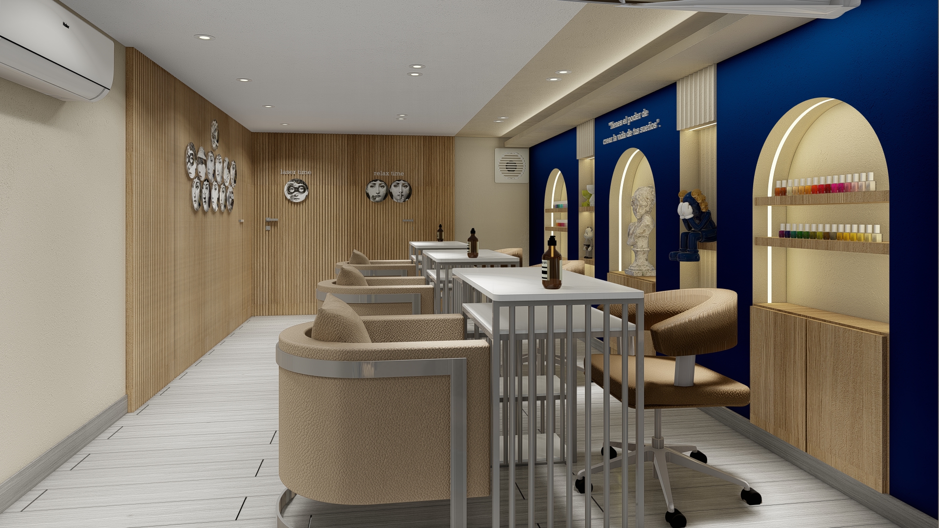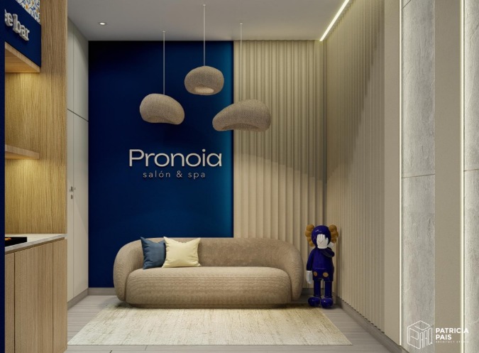 En el proyecto de Pronoia, se logra una atmósfera acogedora mediante la armoniosa combinación de líneas curvas y rectas, que aportan dinamismo y fluidez al espacio. El uso de pisos vinílicos, una paleta de colores claros y el distintivo azul del branding refuerzan la identidad del salón con elegancia y sutileza.