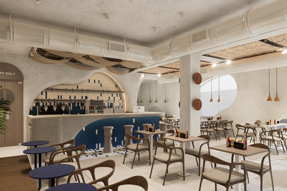 La barra se convierte en el corazón del proyecto, integrando funcionalidad y expresión visual dentro de un diseño orgánico. El mosaico azul aporta un acento vibrante que contrasta con la paleta de tonos beige predominantes, reforzando la identidad renovada de la marca. Su forma fluida acompaña la circulación del espacio, generando un punto de encuentro dinámico que conecta cocina, servicio y experiencia del usuario.