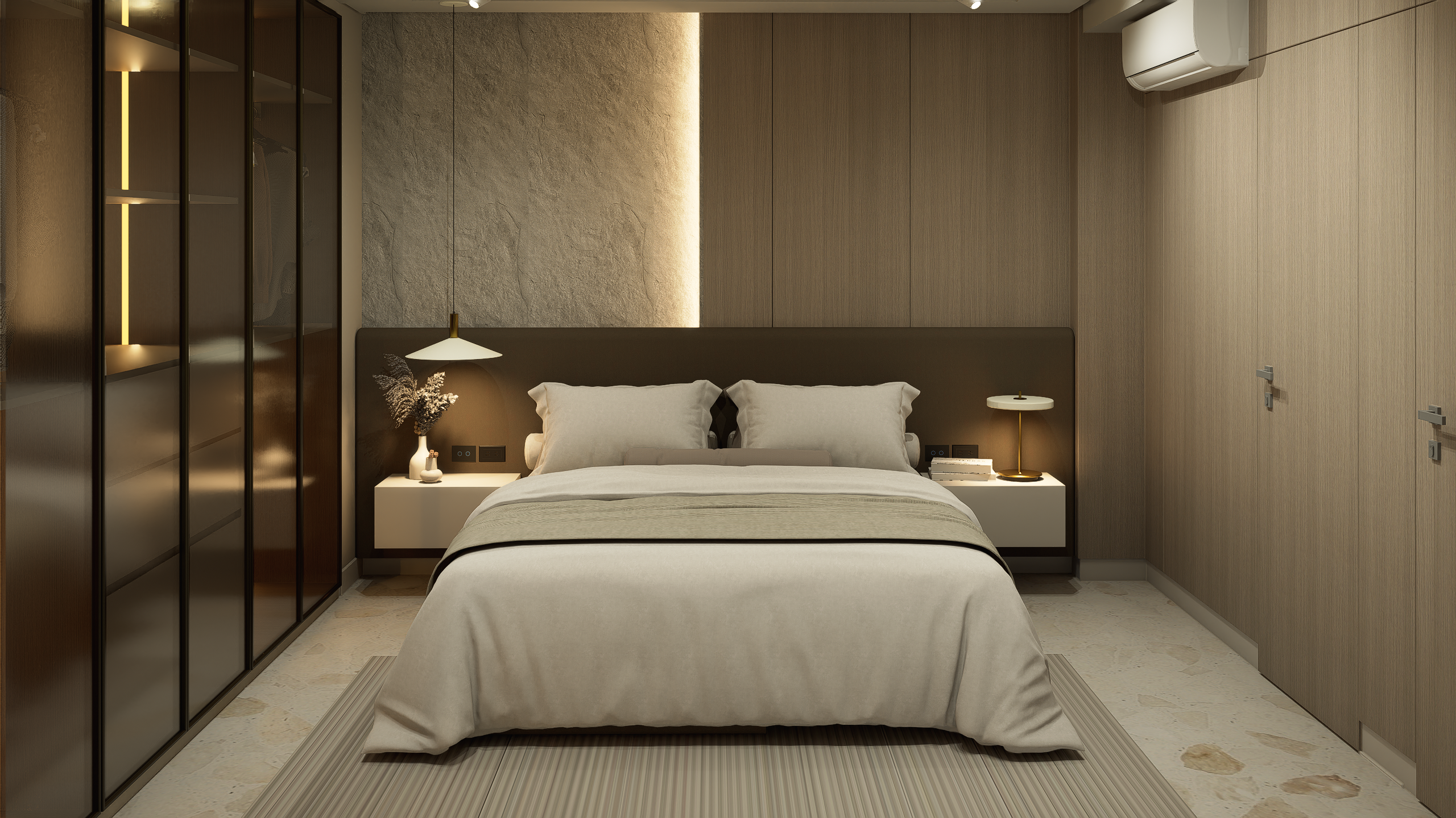 La habitación principal se concibe como un espacio de descanso sereno y sofisticado. Predominan los tonos claros, la madera natural y los textiles suaves. El closet con puertas traslúcidas e iluminación interior añade profundidad visual y refuerza la sensación de diseño integral.