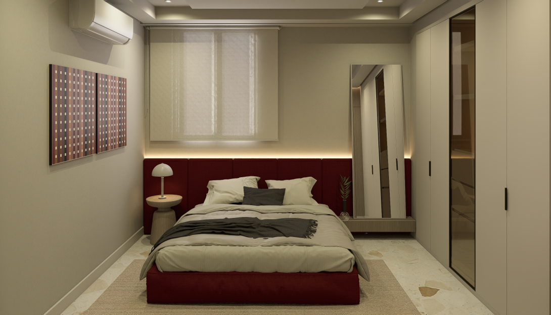 La habitación de huéspedes introduce un acento cromático más marcado, con un cabecero tapizado en tono vino, que aporta carácter y contraste frente a la base neutra del proyecto.