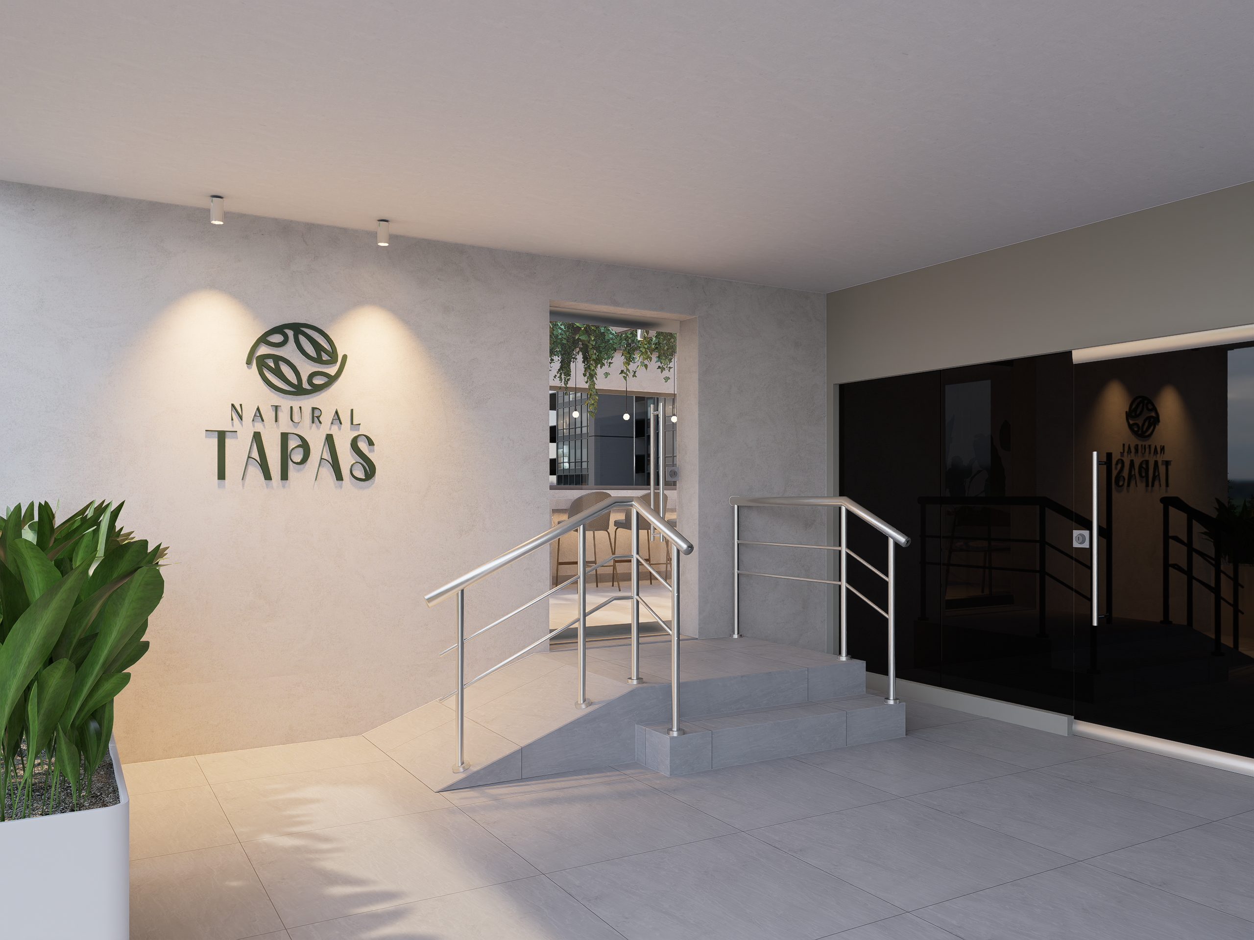 La fachada comunica de manera clara la identidad de Natural Tapas, utilizando una composición sobria, materiales neutros y el logotipo como elemento protagónico. La iluminación puntual realza la marca y genera una imagen elegante y reconocible desde el exterior.