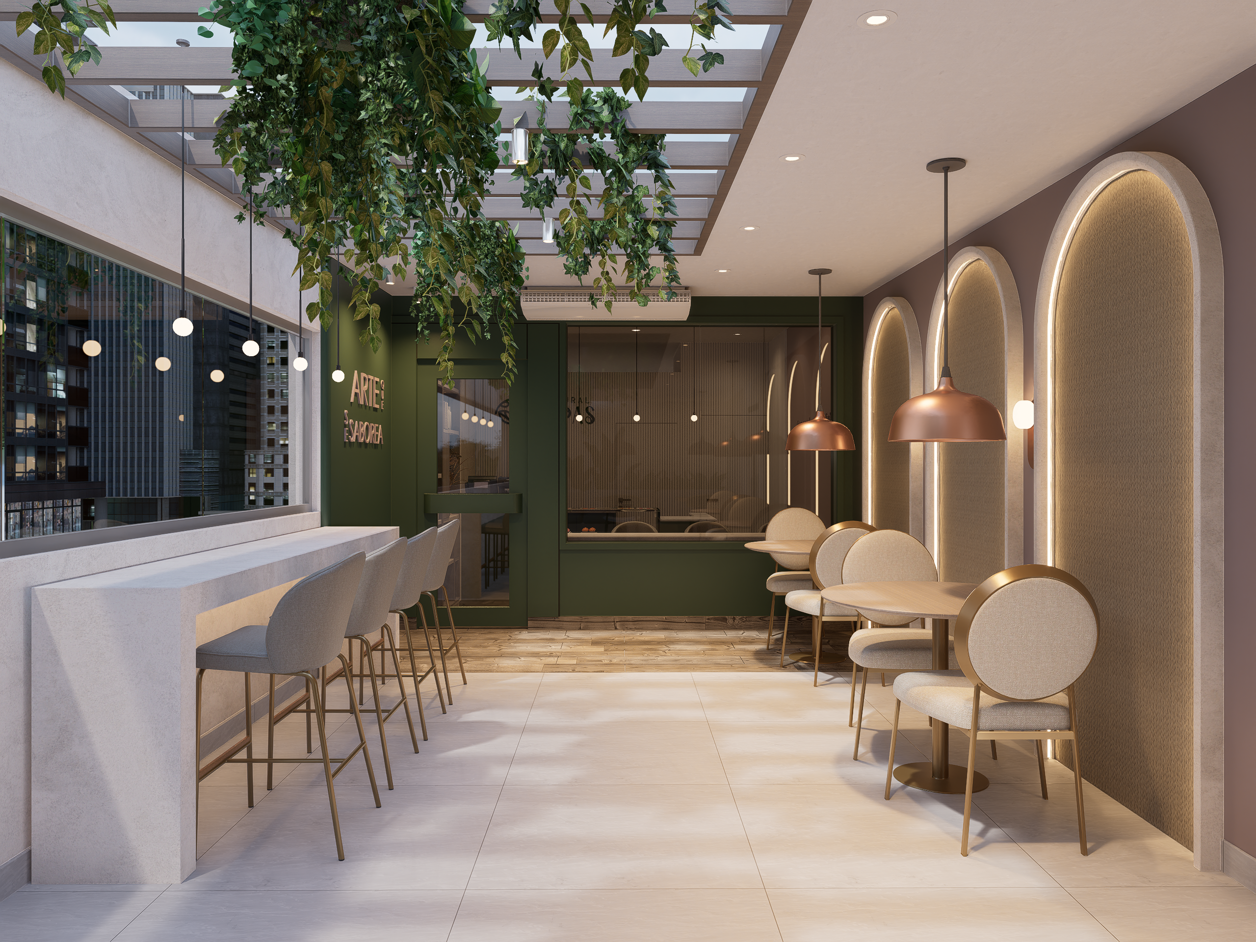 El área de mesas se concibe como un espacio acogedor y envolvente, con nichos arqueados, iluminación cálida puntual y vegetación suspendida que introduce un componente natural y sensorial. La cubierta acristalada permite el ingreso de luz natural, reforzando la conexión con el exterior.